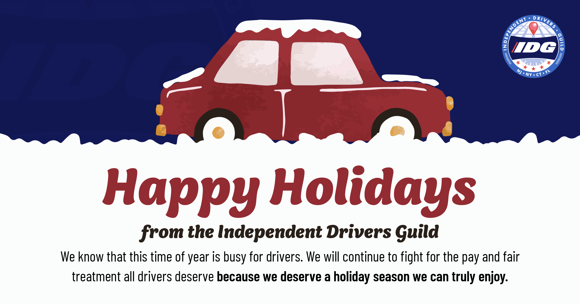 Como siempre, IDG continuará luchando por el pago justo, las protecciones y el respeto que cada conductor merece. Les deseamos a ustedes y a sus seres queridos unas fiestas llenas de calidez, seguridad y alegría.