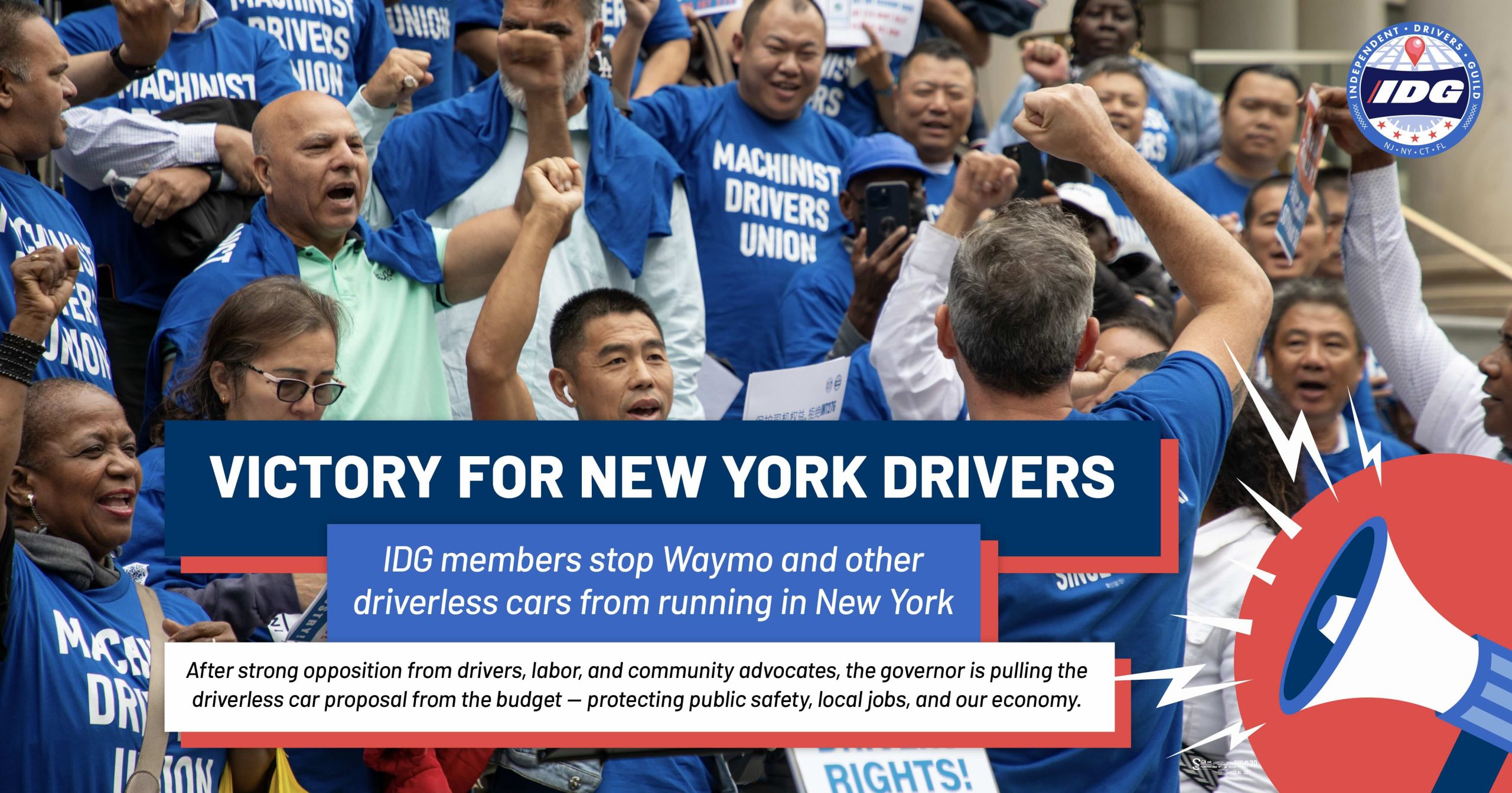 Gracias a todos los miembros de IDG que alzaron su voz, a los más de 20,000 neoyorquinos que firmaron nuestra petición y a nuestros aliados sindicales y comunitarios que nos apoyaron. ¡Esto es lo que sucede cuando los conductores se unen!